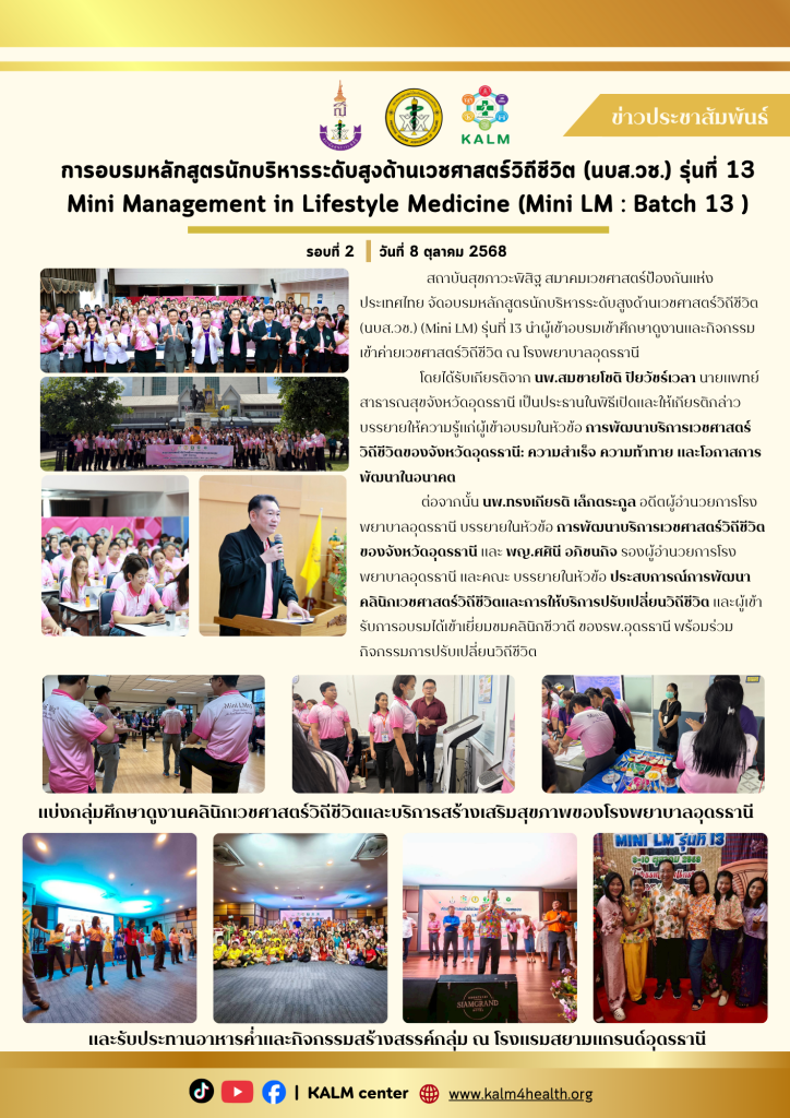 สถาบันสุขภาวะพิสิฐ สมาคมเวชศาสตร์ป้องกันแห่งประเทศไทย จัดอบรมหลักสูตรนักบริหารระดับสูงด้านเวชศาสตร์วิถีชีวิต (นบส.วช.) (Mini LM) รุ่นที่ 13 นำผู้เข้าอบรมเข้าศึกษาดูงานและกิจกรรมเข้าค่ายเวชศาสตร์วิถีชีวิต ณ โรงพยาบาลอุดรธานี