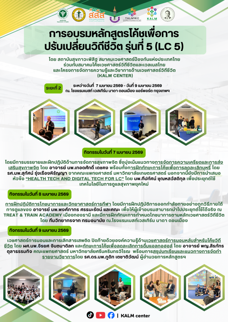 กิจกรรมในวันที่ 7 เมษายน 2569 โดยมีการบรรยายและฝึกปฏิบัติด้านการจัดการสุขภาพจิต ซึ่งมุ่งเน้นแนวทางการจัดการความเครียดและการส่งเสริมสุขภาพจิต โดย อาจารย์ นพ.เทอดศักดิ์ เดชคง พร้อมทั้งการฝึกทักษะการโค้ชเพื่อการลดละเลิกบุหรี่ โดย รศ.นพ.สุทัศน์ รุ่งเรืองหิรัญญา จากคณะแพทยศาสตร์ มหาวิทยาลัยเกษตรศาสตร์ นอกจากนี้ยังมีการนำเสนอหัวข้อ “Health tech and digital tech for LC” โดย นพ.ทีปทัศน์ ชุณหสวัสดิกุล เพื่อประยุกต์ใช้เทคโนโลยีในการดูแลสุขภาพยุคใหม่